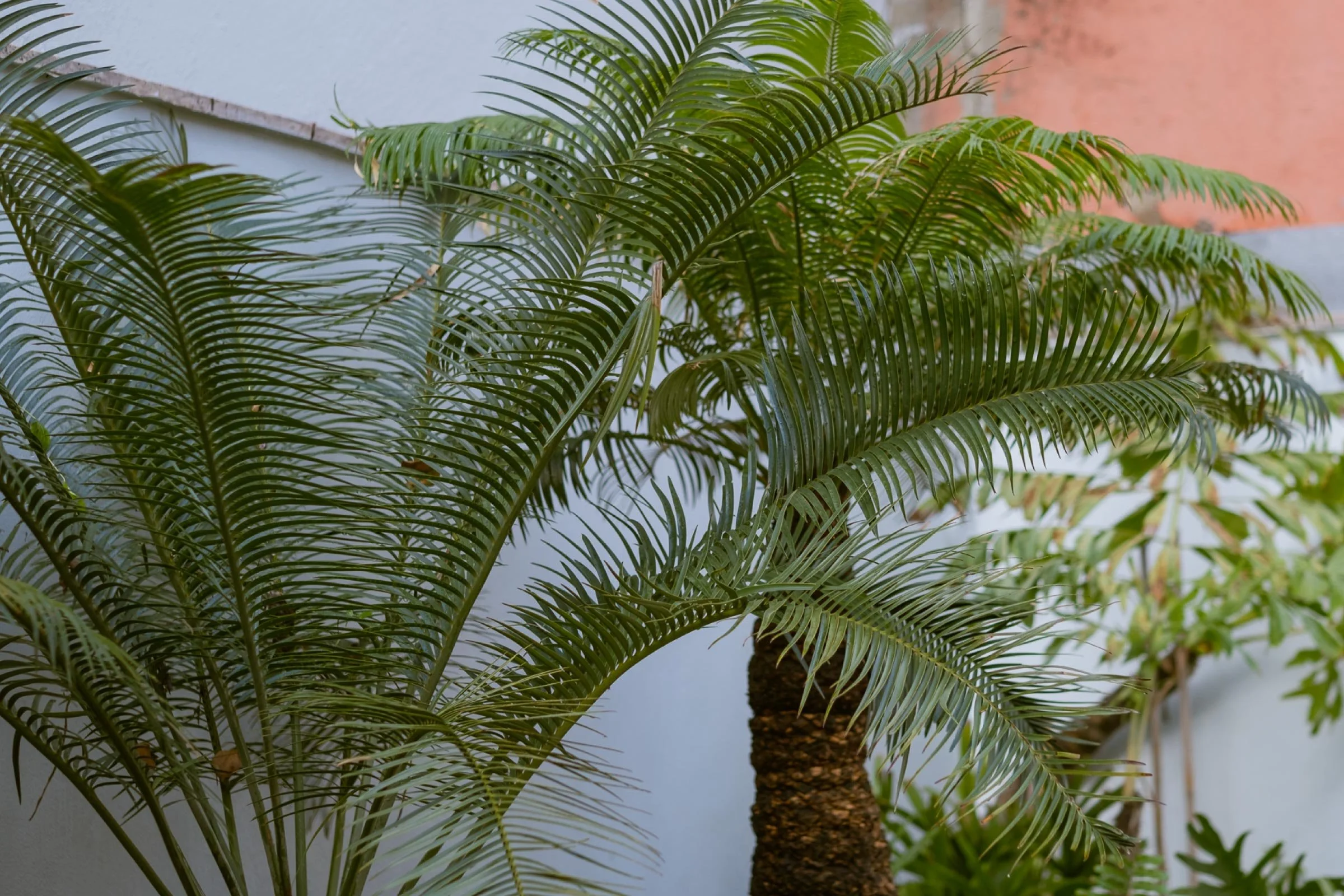 The garden was conceived with a clear tropical identity, shaped by careful botanical selection. Rare, collector-grade specimens (multiple-trunk Zamia furfuracea, a large-crowned Lepidozamia, a mature Cycas circinalis and a young Caryota maxima palm) are layered with ferns, philodendrons, palms and large-leaf foliage, resulting in a lush and immersive garden that balances botanical rarity with spatial precision.